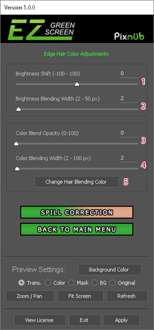 This feature is only available when running the software in dual mask mode. It allows you to optimize and fine tune the color and brightness of the edges hair. This is really helpful when blending the image into a dark or light background. Since strands of hair are sub-pixel resolution, they tend to take on the color and brightness of the background. Spill correction can usually remove spill color. However, when putting the image into a bright or dark background, the stray edge hair are often under or overexposed compared to the background behind it due to the hair being illuminated by the green screen. The edge hair coloring menu allows you to blend the color and lighting of the hair into any background!