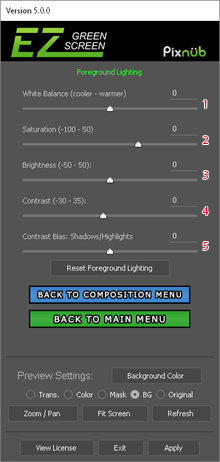 5 - Reset Lighting: Resets all lighting settings back to zero for both the foreground and background.