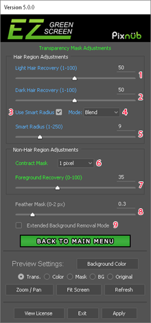 1: Light Hair Recovery: This attempts to recover light hair. 50 is the default value. If you don't want to recover light edge hair then you can turn this down and it will not recover any light hair (may need to turn off smart radius as well). Sometimes this can be pushed up a little. However, you usually can't increase this value too much without bringing the screen partially into the image.